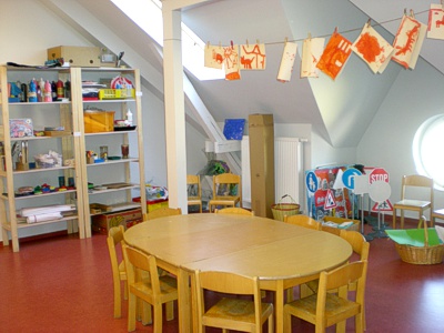 Speisesaal, der mit einer Kinderküche ausgestattet